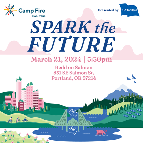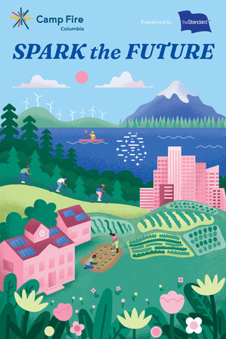 I designed this program booklet for print and hand out at Camp Fire Columbia's 2024 fundraiser gala, Spark the Future. It featured an event program, list of sponsors and donors, auction packages, as well as an annual report and overview of programs run by Camp Fire Columbia. The visual theme was designed to focus on a sustainable future, and nature and our relationship to it, with emphasis on bright colors and organic forms. All visuals were hand-illustrated in Adobe Illustrator and Affinity Designer